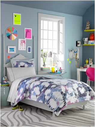 Check out this lovely dorm room design by pbteen- I love all the black and white with the hints of purple. How cute but we cant forget that the room is doing double duty with the twin beds. Love it |